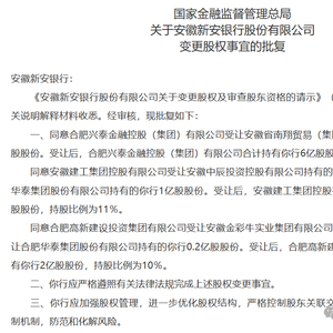 国家金融监督管理总局昨日公告,同意合肥兴泰金融控股集团公司受让安徽省南翔贸易集团公司持有的新安银行6亿股股份;同意安徽建工集团控股公司受让安徽中辰投资控股公司持有的新安银行1.2亿股股份,受让合肥华泰集团公司持有的新安银行1亿股股份;同意合肥高新建设投资集团公司受让安徽金彩牛实业集团公司持有的新安银行1.8亿股股份,受让华泰集团公司持有的新安银行0.2亿股股份。受让后,三者合计持有新安银行51%的股份,形成绝对控股。