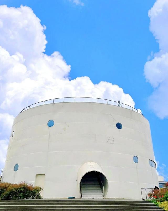 5个白色圆柱形油储罐,内部开阔,工业感十足,春天门口有郁金香,秋季有粉黛子,好像掉进粉色海洋。
