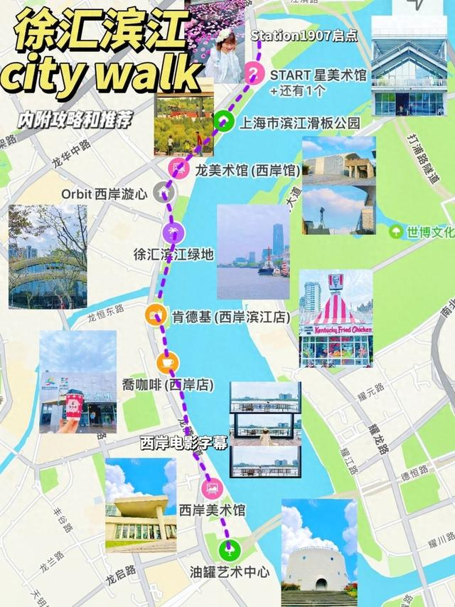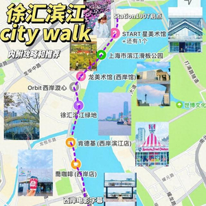 citywalk路线:地铁7、12号线到「龙华中路」地铁站5口出,或者地铁4、12号线至「大木桥路」站1口出。出地铁站后,骑行或者步行1.5公里左右到Station1907。以Station1907为起点-START星美术馆-滨江滑板公园-龙美术馆(西岸馆)-西岸漩心-徐汇滨江绿地-复古加州KFC-乔咖啡-西岸电影字幕-西岸美术馆-油罐艺术中心。路线全长3公里,可以边走边看江景,大概需要半天时间。