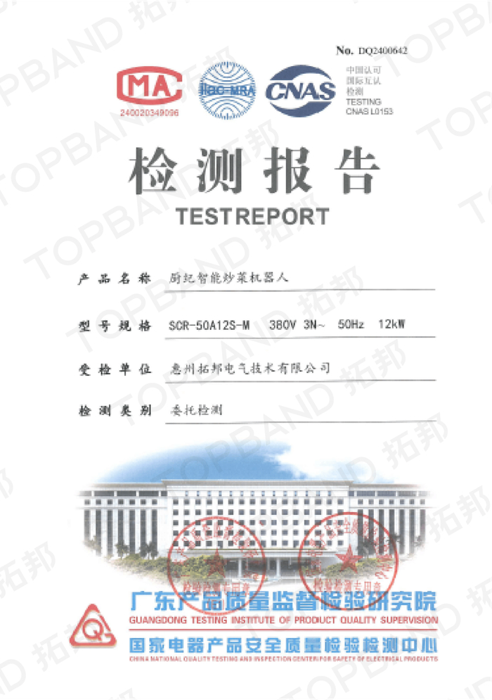 在正式投入市场前,厨纪智能炒菜机器人在实验室内经过了含电磁兼容、安规、可靠性等一系列的测试验证,并且取得了由广东省产品质量监督检验研究所、国家电器产品安全质量检验检测中心认可通过的检测报告,产品性能与安全性均已达到高标准要求。