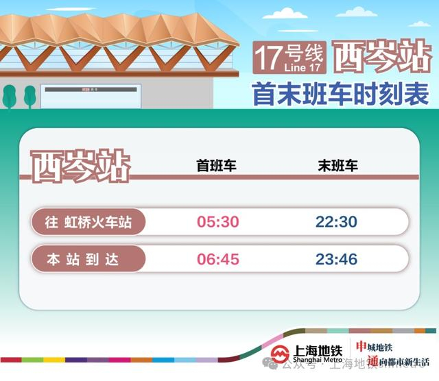 西岑站通车后将作为17号线西端终点站。首末班车方面,西岑站往虹桥火车站站首班车时间为05:30,末班车时间为22:30虹桥火车站站始发首班车到达西岑站时间为06:45虹桥火车站站始发末班车到达西岑站时间为23:46
