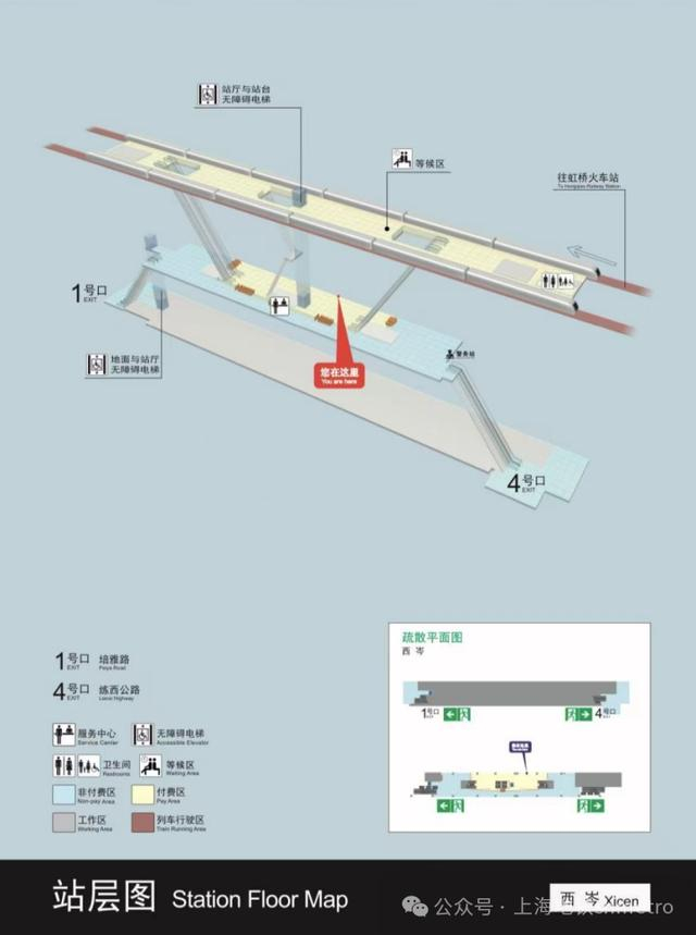 车站设施方面,西岑站初期运营阶段开通1号口和4号口,共2个出入口。同时,为了方便乘客通行,车站安装了2台无障碍电梯。其中1台站厅至站台的无障碍电梯位于付费区内,1台地面至站厅的无障碍电梯位于非付费区靠近1号出入口处。此外,车站公共卫生间(含无障碍厕所)位于站台层,方便乘客使用。