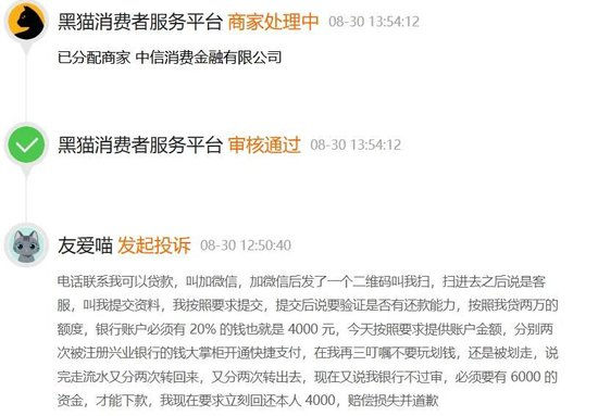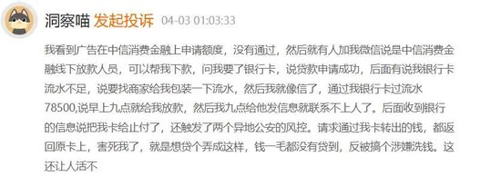 有位消费者表示,其看到广告后在中信消费金融上申请额度,没有通过,然后就有人加微信说是中信消费金融线下放款人员,可以帮忙下款,随后以包装流水为由,索要银行卡信息,并转账78500元,结果银行卡因为涉嫌洗钱被封。