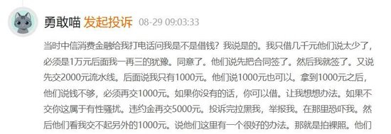 另有消费者表示,其接到自称“中信消费金融”的电话,问其是否需要贷款,在得到肯定的回答后,信贷员声称需要2000元的流水线,但该消费者只有1000元,在收了1000元后,信贷员又以性骚扰恐吓威胁再交5000元,并诱导其拍“裸照”抵款。