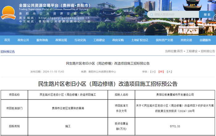 11月21日,贵阳市公共资源交易中心发布民生路片区老旧小区(周边修缮)改造项目施工招标预公告。