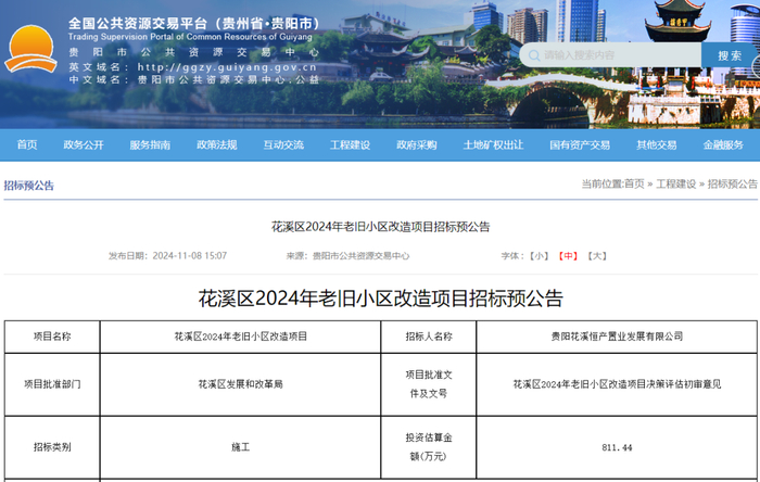 11月8日,贵阳市公共资源交易中心发布花溪区2024年老旧小区改造项目招标预公告。