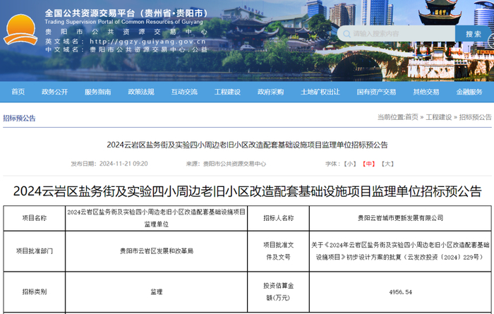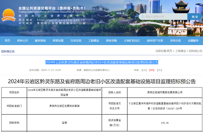 11月21日,贵阳市公共资源交易中心发布2024年云岩区黔灵东路及省府路周边老旧小区改造配套基础设施项目监理招标预公告。