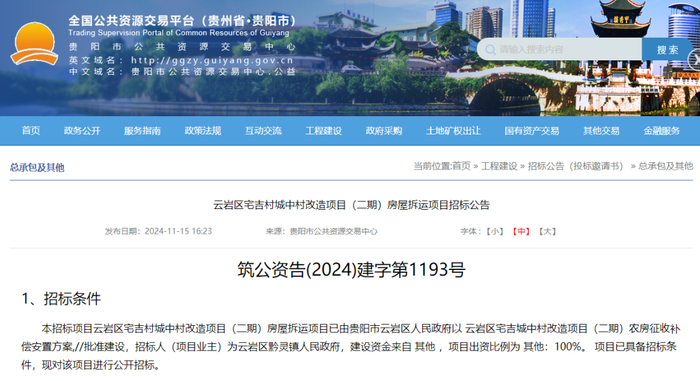 11月15日,贵阳市公共资源交易中心发布云岩区宅吉村城中村改造项目(二期)房屋拆运项目招标公告。