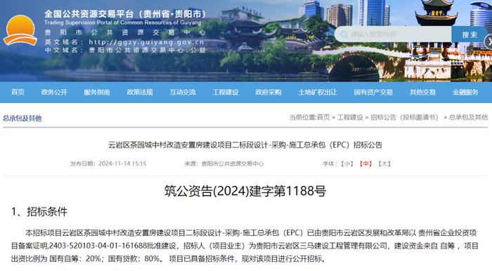 11月20日,贵阳市公共资源交易中心发布云岩区茶园城中村改造安置房建设项目一标段、二标段设计-采购-施工总承包(EPC)招标公告。