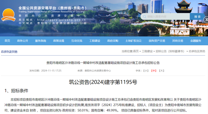 11月19日,贵阳市公共资源交易中心发布贵阳市南明区沙冲路沿线城中村改造项目(一期)二标段设计、施工总承包招标公告。