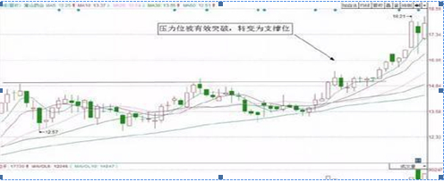 通常股价在运行时,是上有压力下有支撑的,当上方的压力被有效突破时就会转变为支撑,当下方的支撑位被有效跌破时则会转变为压力位,因此,压力位和支撑位是会相互转换的。交易者要学会利用这一点进行分析。如图所示。