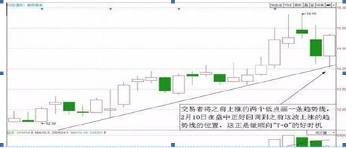 上图是数码视讯2015年1月至2月的日K线走势图,交易者将之前上涨的两个低点画一条直线,便可以看出股价明显走出一个上升通道,2月10日数码视讯在盘中正好回调到之前这波上涨趋势线的下轨位置,下图是当天的分时图。