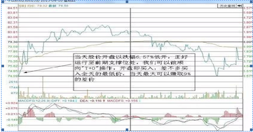 上图是千山药机分时走势图。当天股价以6.57%的跌幅低开,当天股价最低到74.09元,正好是支撑位附近,这时候我们就做顺向“T+0”买入操作。低开开盘我们就买入,此时差不多可以买入全天最低价,当天最大可以赚取约9%的差价。