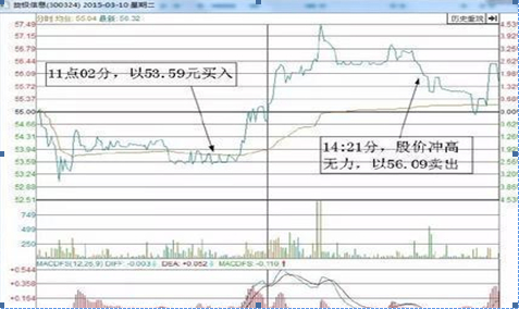 如图所示,11点02分笔者以53.59元对该股做顺向的“T+0”操作,到14点21分的时候,股价冲高无力,回落跌破右肩,果断以56.09元卖出。