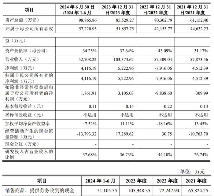 2021年至2024年1-6月,联芸科技的营业收入分别为57,873.56万元、57,309.04万元、103,373.62万元和52,708.22万元;净利润/归属于母公司股东的净利润分别为4,512.39万元、-7,916.06万元、5,222.96万元和4,116.19万元;扣除非经常性损益后归属于母公司股东的净利润分别为309.99万元、-9,838.60万元、3,105.03万元和1,761.91万元。