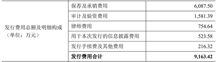 联芸科技本次发行费用合计9,163.42万元,其中保荐及承销费用6,087.50万元。