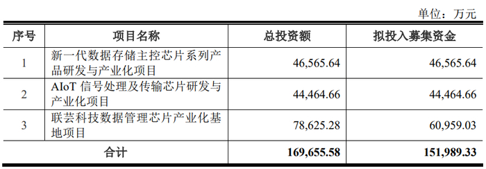 联芸科技本次发行募集资金总额为112,500.00万元,扣除发行费用后募集资金净额为103,336.58万元,公司募集资金净额比原计划少48,652.75万元。联芸科技2024年11月22日披露的招股书显示,公司拟募集资金151,989.33万元,用于新一代数据存储主控芯片系列产品研发与产业化项目、AIoT信号处理及传输芯片研发与产业化项目、联芸科技数据管理芯片产业化基地项目。