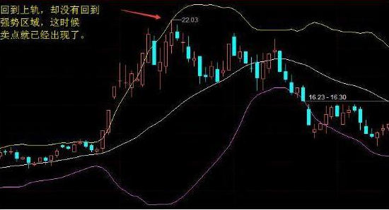 像下图这样,创出新高,接触了上轨,但是并没有回到强势区域,说明卖点出现,可以考虑减仓或抛出了。