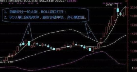 3、 之前就经过一波大涨,BOLL袋口也呈现打开状态,当OBLL收口时,股价从中轨下方穿越上来,这时候可能会发生新的行情。这时经典的逐浪上攻形态: