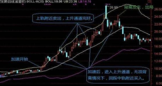 4、 对于上面说的这三种刚进入加速后的股票,尖顶回落中轨,通常都是买入机会,之后至少会有一次上攻,上攻的力度较强,能够再次攻击山鬼,就构成上升通道,回落中轨都可以再次买;力度弱,构成了背离,这时候就要出局了。这是在上升通道做强势股的方法: