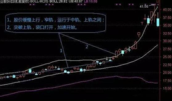 2、 股价横盘震荡或缓慢上行,BOLL呈现平行窄轨,股价运行在BOLL中轨和上轨之间,某天突然加速,突破了上轨 ,BOLL的袋口(上下轨)也呈现打开的态势,这时发生行情的概率较大。这时经典的加速上涨形态: