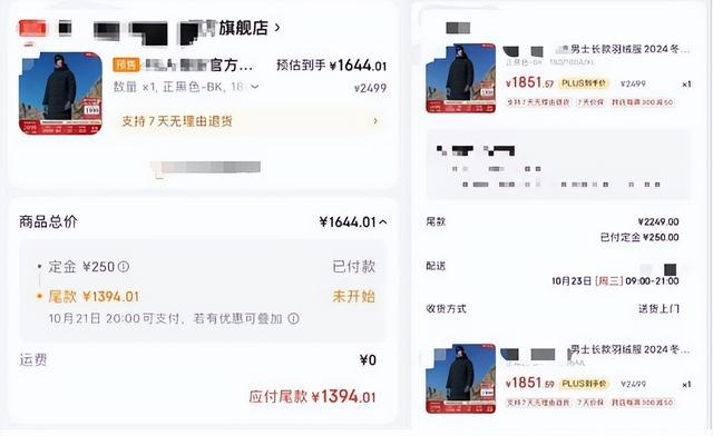 近日,多名消费者向媒体记者反映,多家电商平台存在促销陷阱,有的商品一夜之间涨价数百元,让凑单满减后的价格反而高于活动前。还有消费者发现,支付定金后,尾款竟然涨价。“双11”活动开始前,潘先生准备在某电商平台入手两件早就看好了的羽绒服,商品价格均为2499元。为了获得更大优惠,潘先生在活动前特意开通了该电商平台会员,领取了一张满3000元减240元的补贴券,准备在支付尾款时使用,再算上跨店满300元减50元的优惠,系统显示,他看中的两件羽绒服预估到手价均为1644.01元。促销活动开始后,他支付了两笔定金,每笔250元。系统显示,10月21日晚8点后,他只需要每个订单再支付1394.01元。然而到了支付尾款的时间,两件羽绒服的尾款全都变成了1706.05元,单价比之前贵了312.04元。受限于平台规定,潘先生只能先支付全部尾款。而这时打开商品页面,两件羽绒服的预估到手价也分别变成了1851.57元和1851.59元,比之前贵了200多元。