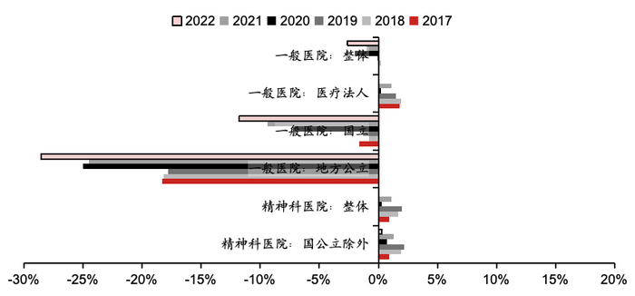 根据厚生劳动省《医疗经济状况调查》统计,疫情前(取2017-2019年中位值)日本一般医院整体利润率在-0.1%至0.2%的微盈微亏区间波动,其中民营医疗法人为微利(1.5%-2%),国立医院为微亏(-2%以内),地方公立医院亏损幅度较大(-20%左右)。
