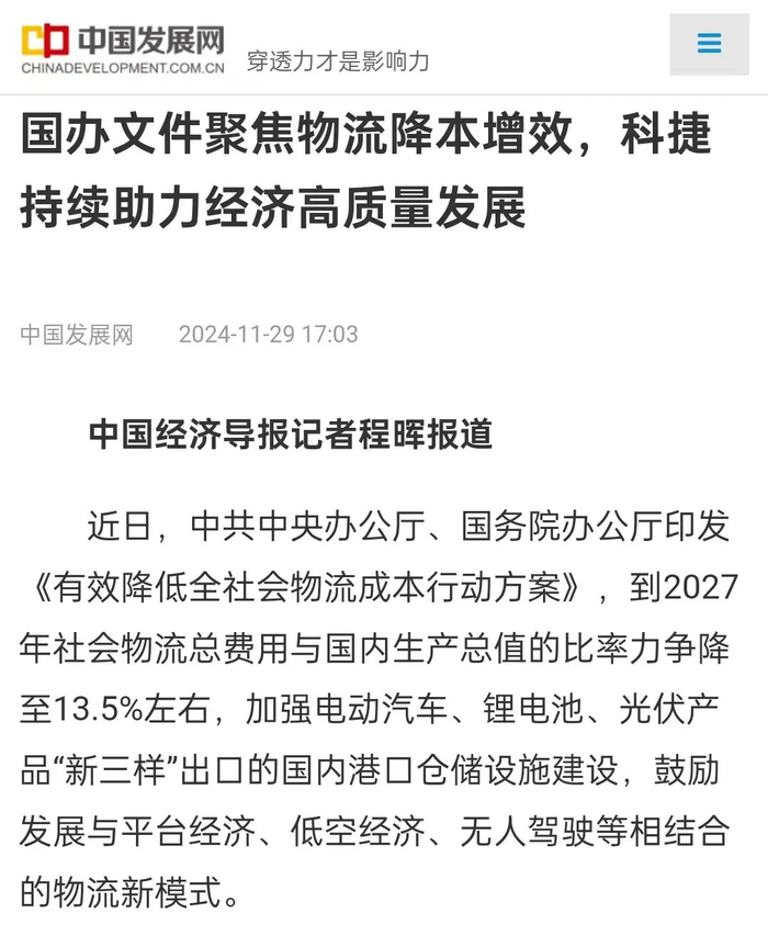 近日,中共中央办公厅、国务院办公厅印发《有效降低全社会物流成本行动方案》,到2027年社会物流总费用与国内生产总值的比率力争降至13.5%左右,加强电动汽车、锂电池、光伏产品“新三样”出口的国内港口仓储设施建设,鼓励发展与平台经济、低空经济、无人驾驶等相结合的物流新模式。