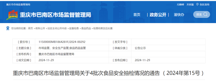 重庆市巴南区市场监督管理局关于4批次食品安全抽检情况的通告 (2024年第15号)