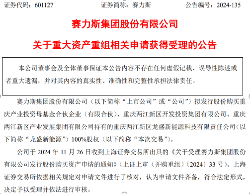 11月26日—27日,赛力斯连发多份公告,通报关于其拟发行股份购买重庆两江新区龙盛新能源科技有限责任公司(下称“龙盛新能源”)100%的股权并购重组的事项。目前,该交易申请已获上海证券交易所受理,并依法进行审核。若交易完成,重庆国资将顺势成为赛力斯重要股东。