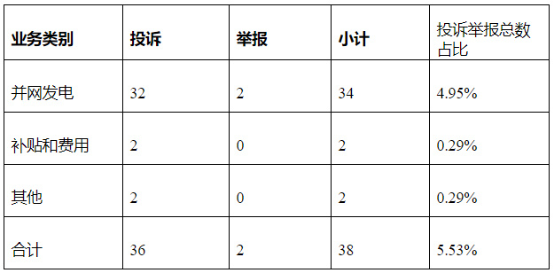 新能源和可再生能源行业排在第二位,数量为38件、占投诉举报总数的5.53%,主要集中在并网发电方面。