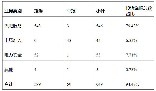电力行业排在首位,数量为649件、占投诉举报总数的94.47%,主要集中在供电服务、市场准入、电力安全等方面。