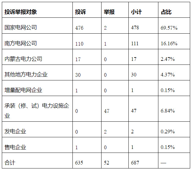 供电企业637件、占投诉举报总数的92.72%,其中国家电网公司478件、占投诉举报总数的69.57%,南方电网公司111件、占投诉举报总数的16.16%,内蒙古电力公司17件、占投诉举报总数的2.47%,其他地方电力企业30件、占投诉举报总数的4.37%,增量配电网企业1件、占投诉举报总数的0.15%;承装(修、试)电力设施企业47件、占投诉举报总数的6.84%;发电企业2件,占投诉举报总数的0.29%;售电企业1件、占投诉举报总数的0.15%。