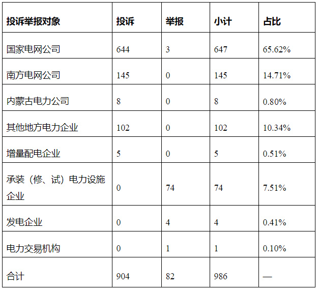 从被投诉举报对象看,供电企业907件、占投诉举报总数的91.99%,其中国家电网公司647件、占比65.62%,南方电网公司145件、占比14.71%,内蒙古电力公司8件、占比0.8%,其他地方电力企业102件、占比10.34%,增量配电企业5件、占比0.51%;承装(修、试)电力设施企业74件、占比7.51%;发电企业4件、占比0.41%;电力交易机构1件、占比0.1%。