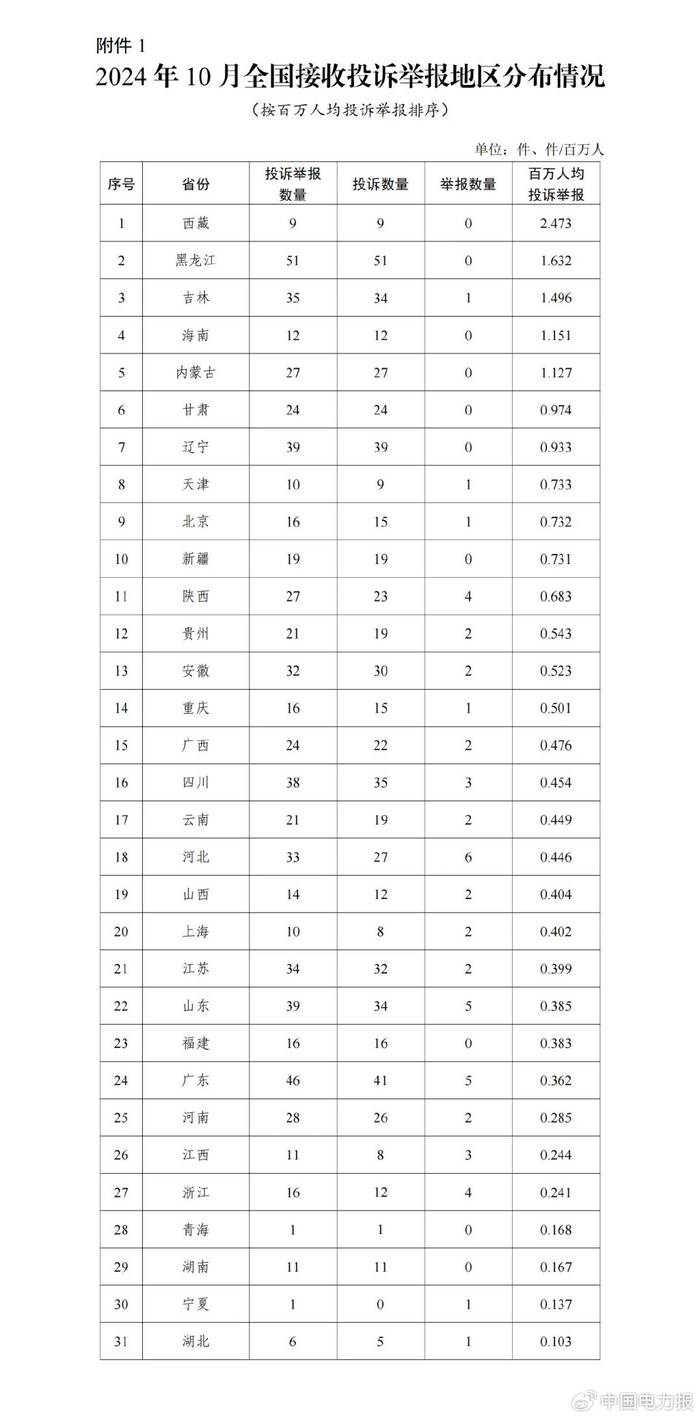 各省(自治区、直辖市)按照接收投诉举报数量排序,黑龙江、广东、辽宁、山东、四川排在全国前5位。按百万人均投诉举报数量排序,西藏、黑龙江、吉林、海南、内蒙古排在全国前5位。(2024年10月全国接收投诉举报地区分布情况见附件1)