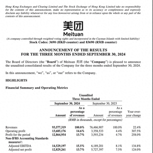美团发布2024年Q3财报:季度营收936亿元 同比增长22.4%