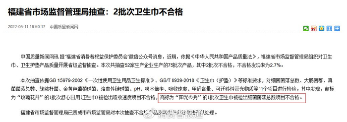 抽检数据显示,这家公司旗下的一款阳光之秀萌女系列护垫(货号:7458 25片 160mm长)在“产品销售标志”上不合格;新欣芯有独钟160医护级护垫(160MM 25片 货号:6010)在“产品标识”上不合格。值得一提的是,2022年,一款商标为“阳光の秀”的卫生巾(290MM 夜用 7片/包),因“细菌菌落总数”不合格被通报(如下图所示)。