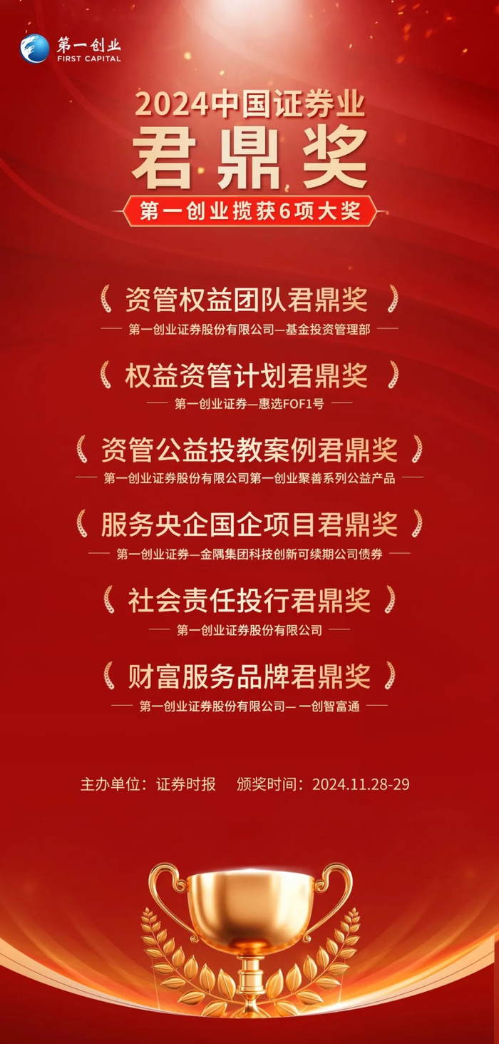 11月28日至29日,由证券时报主办的“2024中国金融机构年度峰会”在深圳召开,其间颁布“2024年度中国证券业君鼎奖”。第一创业揽获“2024中国证券业资管权益团队君鼎奖”、“2024中国证券业权益资管计划君鼎奖”、“2024中国证券业资管公益投教案例君鼎奖”、“2024中国证券业服务央企国企项目君鼎奖”、“2024中国证券业社会责任投行君鼎奖”、“2024中国证券业财富服务品牌君鼎奖”6项大奖。