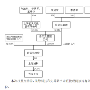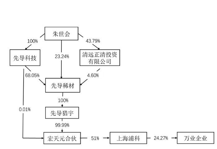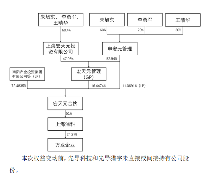 本次权益变动后,宏天元合伙、上海浦科、万业企业之间持股链条并未改变。而先导科技集团、先导猎宇将合计持有宏天元合伙100%份额,并间接持有上海浦科51%股权,间接控制万业企业24.27%的股份表决权,公司实控人变更为朱世会。