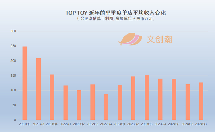 文创潮根据TOP TOY的单季度收入和各季度末门店数粗略计算,今年Q3其平均单店收入约127万元(实际收入要减去电商、快闪等板块),同比下滑16%。