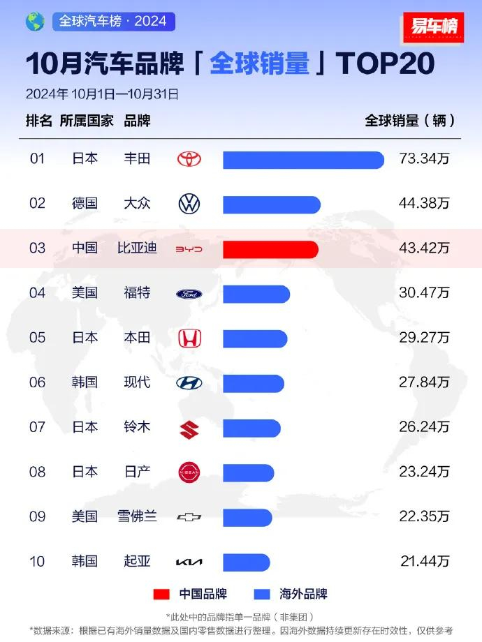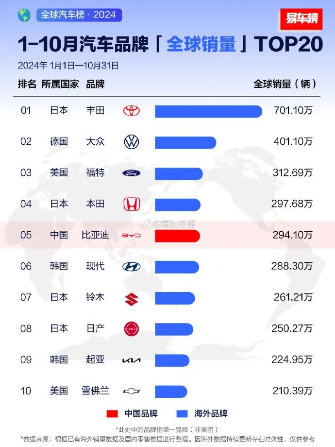 与此同时,易车榜的最新统计数据也验证了比亚迪的强劲表现。在10月份的单月销售中,比亚迪(品牌)以出色的销售业绩排名全球第三,显示出其在新能源汽车市场的领先地位。而1至10月份的品牌销量更是已经位居全球第五位,这一成绩不仅是对比亚迪产品质量和技术创新的肯定,也是对其全球化战略的有力支撑。