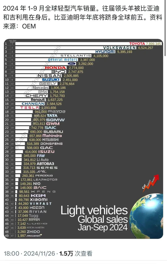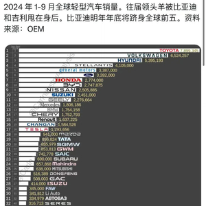近日,全球汽车行业的权威研究机构Car Industry Analysis发布了2024年1至9月的全球汽车销售数据,揭示了各大汽车制造商在全球市场的竞争态势。其中,中国新能源汽车领军企业比亚迪(集团)的表现尤为亮眼,以274万台的销量排名全球第八,展现出强大的市场竞争力和增长潜力。