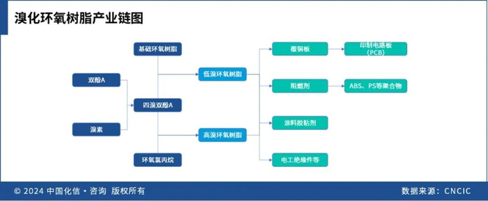 溴化环氧树脂产品主要包括四溴双酚A型环氧树脂、溴化酚醛环氧树脂、二溴季戊二醇二缩水甘油醚、N,N-二缩水甘油-2,4,6-三溴苯胺、二溴甲苯缩水甘油醚、1,3-二缩水甘油-4,5,6,7-四溴苯并咪唑酮等。重要品种有溴化双酚A型环氧树脂和溴化线型酚醛环氧树脂,四溴双酚A环氧树脂使用最为广泛,其中包括溴含量46%-50%的高溴化树脂(HBR)和溴含量16%-24%的低溴化树脂(LBR)。本文后续所述溴化环氧树脂一般均指四溴双酚A环氧树脂。