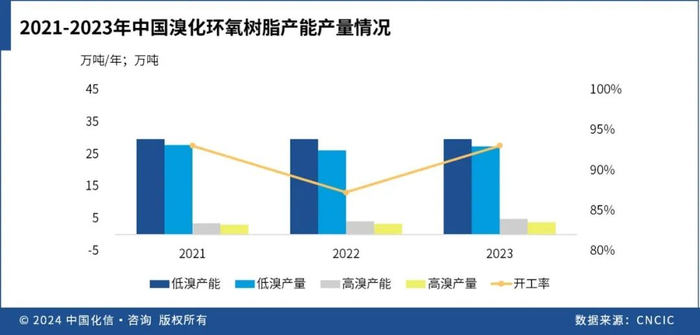 长期以来,我国溴化环氧树脂产能不足。在低溴环氧树脂方面,国内生产企业均自身配套覆铜板业务,产能集中在建滔化工、昆山南亚、宏昌电子和长春化工,市场流通量不多。过去3年,中国溴素价格高且波动剧烈造成低溴环氧树脂生产成本高,下游覆铜板行业持续低迷,因此,低溴环氧树脂企业扩产意愿不强。在高溴环氧树脂方面,国内生产企业以覆铜板企业上游少量配套为主,鉴于近3年我国工程塑料、ABS等通用塑料的产量大幅增加,山东天一化学等莱州湾地区溴素生产企业纷纷布局高溴环氧树脂产能。
