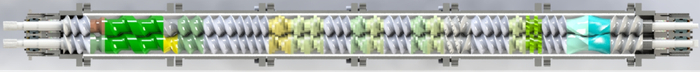 曼恩斯特推出的陶瓷双螺杆挤出机,其螺杆为双支撑结构,受力均匀,螺纹元件与套筒之间摩擦力小、磨损小,整体功率比传统形式降低10%。同时结构紧凑、占地面积小,更换周期长,维护成本低。