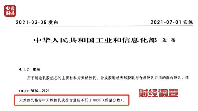 根据2021年中华人民共和国工业和信息化部发布的乳胶垫执行标准 (HG/T 5836-2021),规定天然乳胶含量不低于88%才能被认为是高质量的乳胶床垫。而只加了必要助剂乳胶含量达到93%的乳胶产品,市面上也并不多见。大多数商家为了降低成本都会加入一些滑石粉,其产品的乳胶含量基本上都在80%左右。