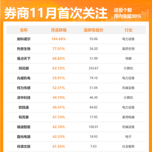 具体来看,涨幅位居第一的是纳科诺尔,该股11月以来获国联证券首次关注,给予“买入”评级。