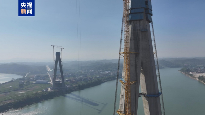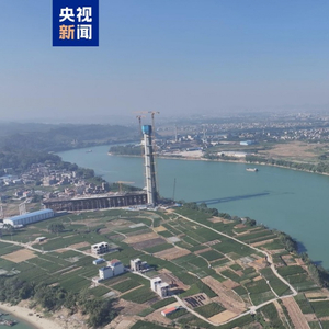 11月29日,广西横钦高速公路郁江特大桥北岸主塔封顶,大桥建设取得重大进展。