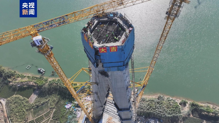 郁江特大桥是横钦高速公路的关键控制性工程,位于广西壮族自治区横州市横州镇与那阳镇之间,是一座主跨度580米的双塔混合梁斜拉桥,分南北两座主塔,桥梁总长2200米,在世界斜拉跨径排名第79。此次封顶的郁江特大桥北岸主塔塔柱分为29节,截面呈“正六边形”结构,高169米。
