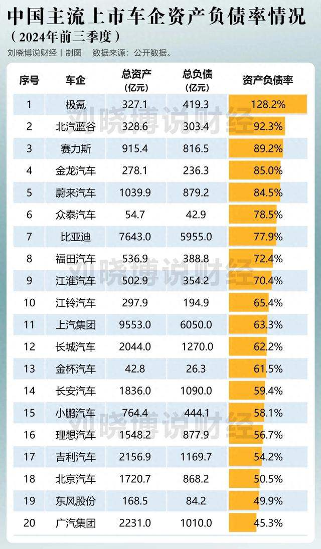 今年前三季度,20家A股港股上市车企的平均资产负债率为70.2%,中位数为64.4%。